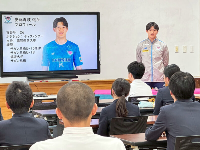 玄海みらい学園で開催された『サガン鳥栖の日』先生たちはサガン鳥栖のユニフォームを着て、掲揚台にはサガンフラッグ。...