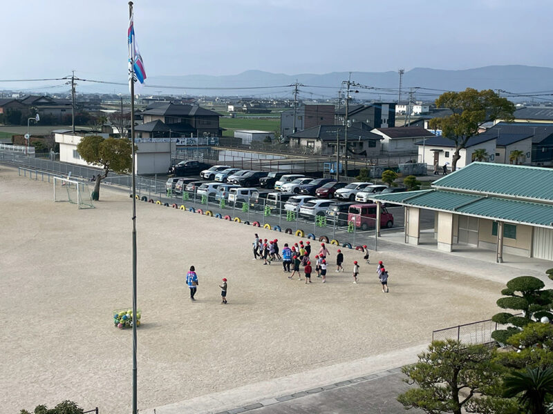 江北小学校で開催された県内初の『サガン鳥栖の日』先生たちはサガン鳥栖のユニフォームを着て、掲揚台にはサガンフラッ...