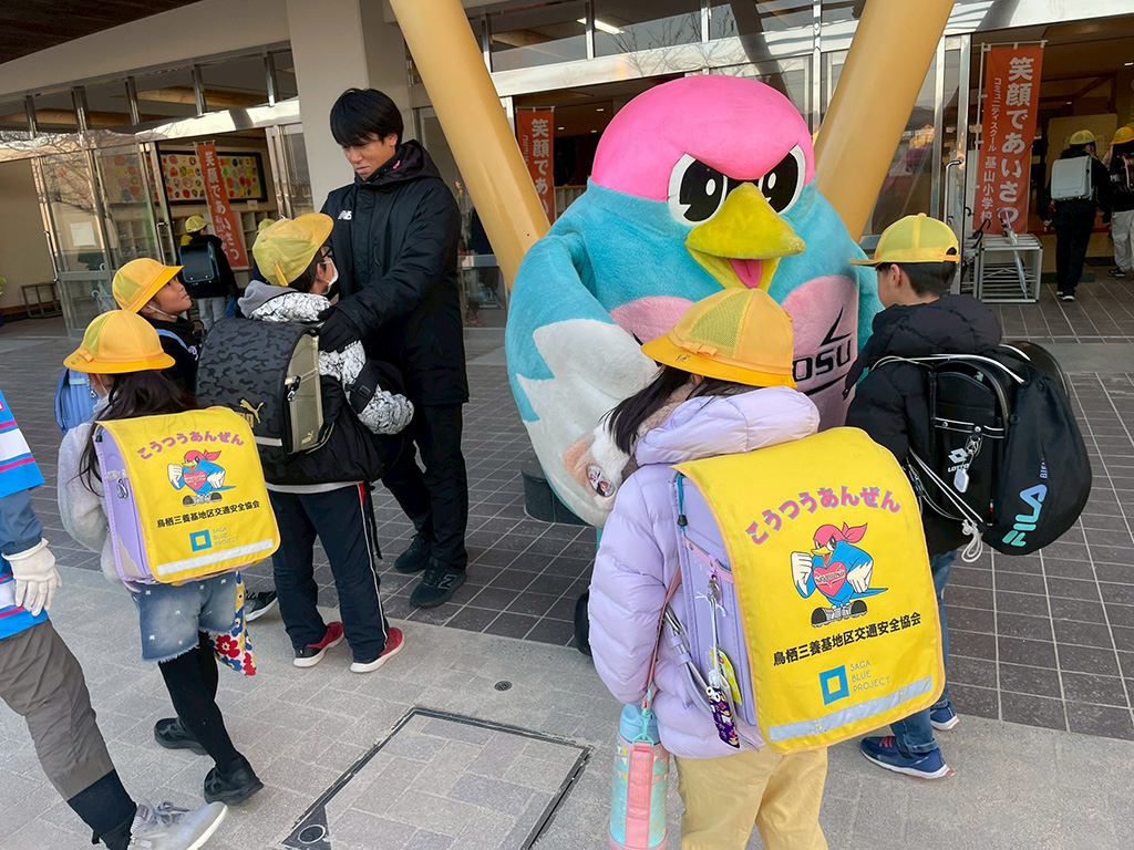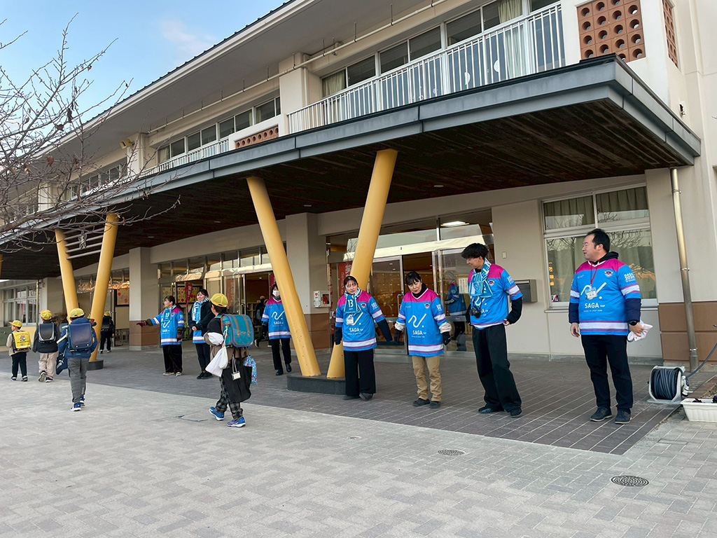 この日の朝はなんと、先生方がみんなでサガン鳥栖のユニフォームを着用して一緒にあいさつに立ってくれたのです