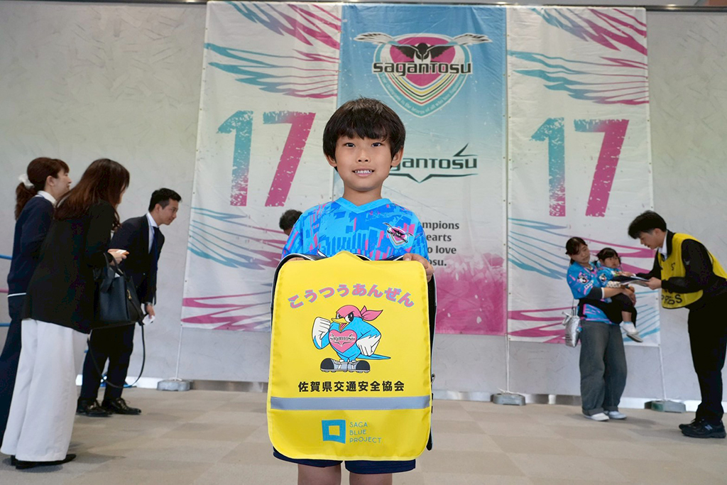 佐賀県内の交通安全対策に佐賀県、佐賀県交通安全協会、サガン鳥栖が協力して交通安全対策への取組みの一環として、令和8年度に小学1年生になる佐賀県内の小学生(約6,800名)へ3者で共同購入したランドセルカバーを贈呈しました。